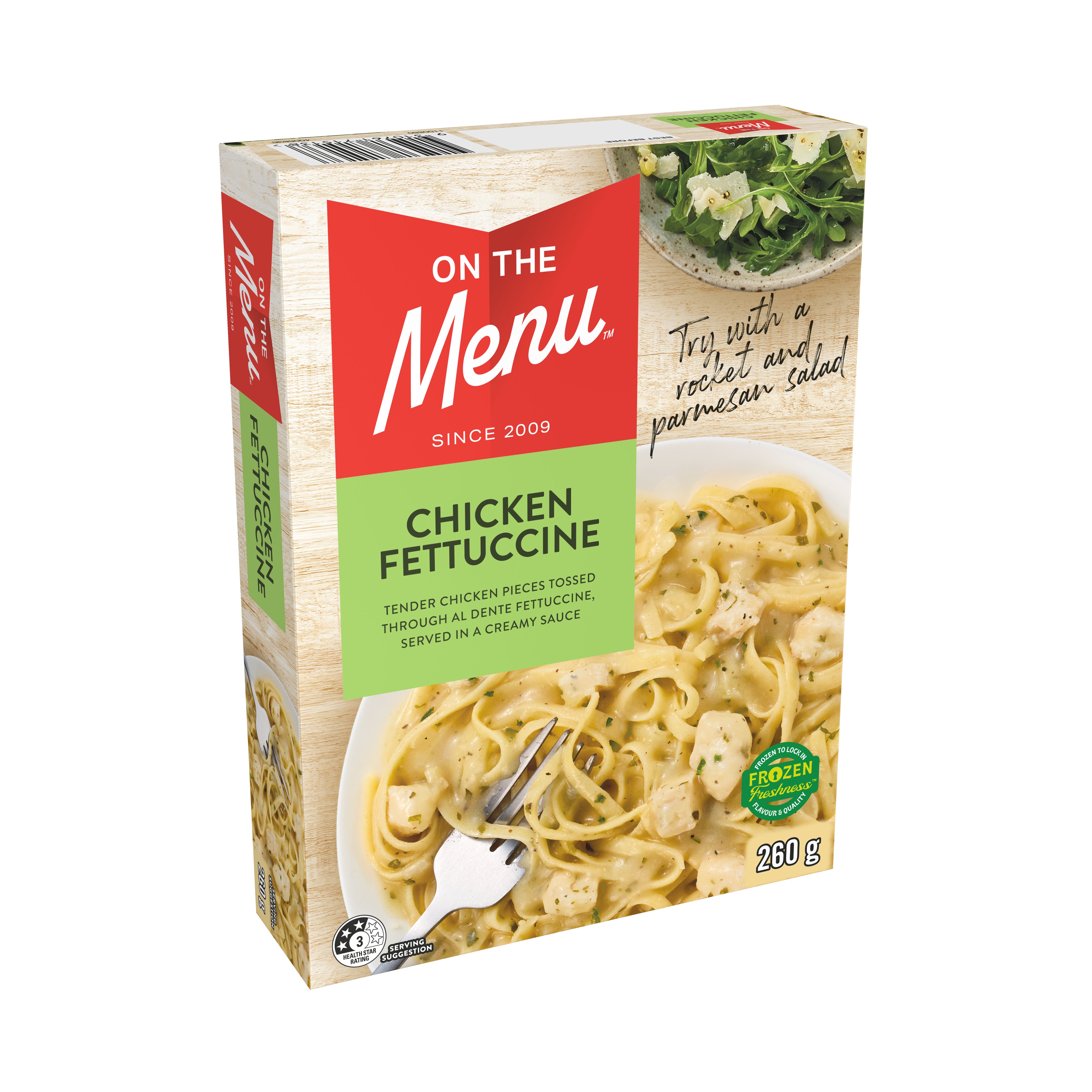 Creamy Sauce (58%) [Water, Onion, Butter (Milk), Thickener (1422), Milk Solids, Vegetable Oil, Salt, Chicken Flavour {Flavour Enhancers (627, 631) (Wheat)}, Herbs, Spice], Cooked Pasta (34%) [Water, Wheat Semolina, Vegetable Oil], Cooked Marinated Chicken (8%) [Chicken, Water, Salt, Thickener (407a), Spices, Mineral Salts (451, 450), Sugar].