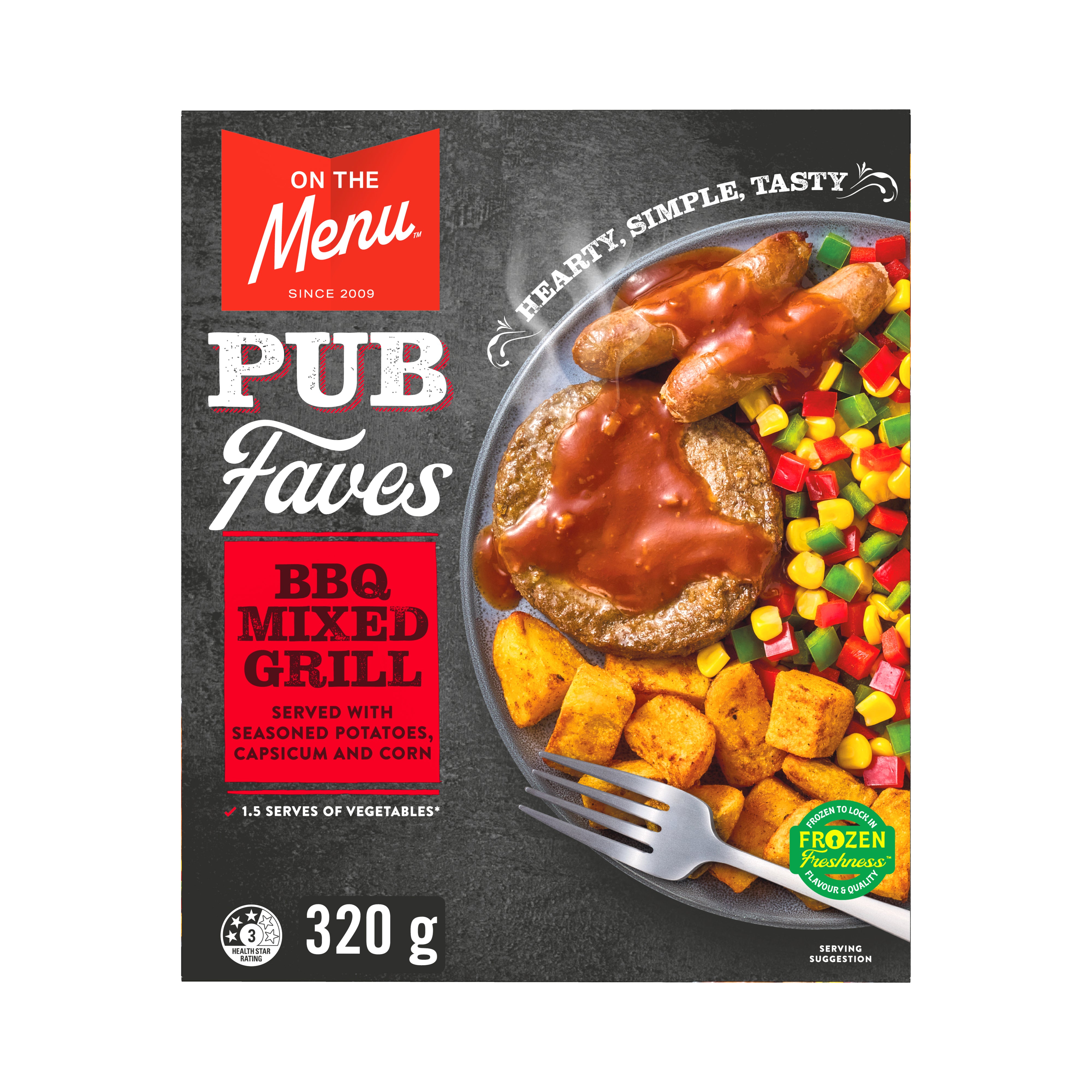 Indulge in our Pub Faves BBQ Mixed Grill, featuring a succulent beef patty and two savory sausages, smothered in our irresistible smoky bbq sauce. Served with hearty potatoes, flavorful capsicum, and sweet corn. Satisfy your cravings with this delectable dish!